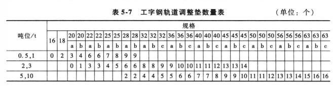2、根據(jù)選用工字鋼型號(hào)規(guī)格的不同,調(diào)整電動(dòng)小車的墊圈數(shù)量,要保證兩側(cè)輪緣與工字鋼間要有3-5mm的間隙。工字鋼軌道調(diào)整墊數(shù)量見表5-7.