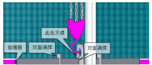 脹圈用槽鋼滾弧制成,曲率半徑與儲罐內(nèi)徑相同。在電動葫蘆正下方的脹圈上焊接吊耳。此處需特別注意,脹圈吊耳兩側(cè)各一米左右需采用加強(qiáng)筋與加強(qiáng)版加固,吊耳只與脹圈焊接,不得將吊耳與罐壁相焊,以免提升時電動葫蘆的傾角拉力造成罐壁下側(cè)向內(nèi)受拉變形。脹圈與罐壁使用龍門卡具相連,龍門卡具的位置不得靠吊耳過近,太近容易造成罐壁受拉變形,也不得離吊耳過遠(yuǎn),過遠(yuǎn)會造成脹圈受扭轉(zhuǎn)力過大而變形。