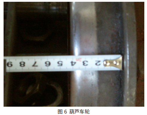 該起重機的電動葫蘆由于損壞已經拆卸下來,從車輪的磨損痕跡可以看到該電動葫蘆的安裝情況。從圖6可以看到車輪只有約20mm的寬度與工字鋼接觸,有20mm的間隙部位沒有與工字鋼接觸。