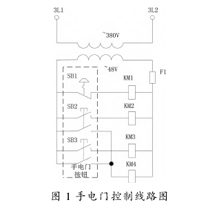 手電門控制電動(dòng)葫蘆的控制器線路圖如圖1所示,急停開(kāi)關(guān) SB1 拔起后接觸器 KM1 得電,電動(dòng)葫蘆動(dòng)力電上電,SB2 和 SB3 為雙擋按鈕,通過(guò)操作按鈕控制電動(dòng)葫蘆以低速或高速進(jìn)行上升或者下降運(yùn)行,手電門通過(guò)移動(dòng)電纜和牽引繩懸掛在葫蘆下方隨葫蘆水平方向一起運(yùn)行。